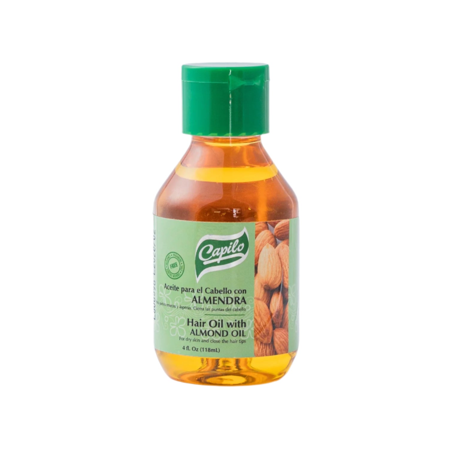Aceite de Almendras Capilo 4 oz. Este aceite está formulado con ingredientes naturales como el aceite de almendras, diseñado para proporcionar hidratación y suavidad al cabello y la piel. Ofrece nutrición profunda y ayuda a cerrar las puntas abiertas, promoviendo un cabello más saludable y brillante.