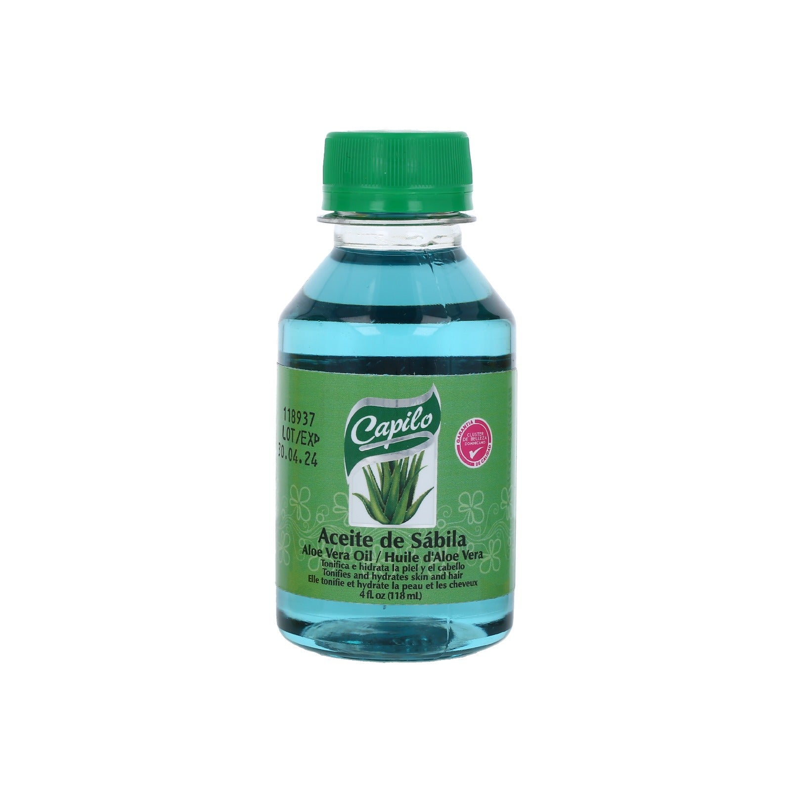 Aceite de Aloe Vera Capilo 4 oz. Tratamiento hidratante y revitalizante ideal para el cuidado del cabello y la piel. Su fórmula combina aceite mineral con extracto de aloe vera, ayudando a mantener una apariencia saludable y fresca.