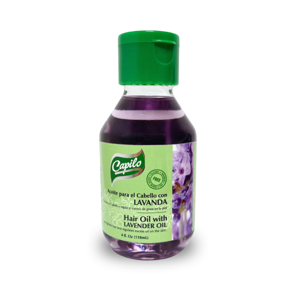 Aceite de Lavanda Capilo 4 oz. Tratamiento natural multifuncional ideal para el cuidado del cabello y la piel. Su fórmula con extracto de lavanda proporciona hidratación, relajación y bienestar general, mientras nutre profundamente y combate el estrés del cuero cabelludo y la piel.