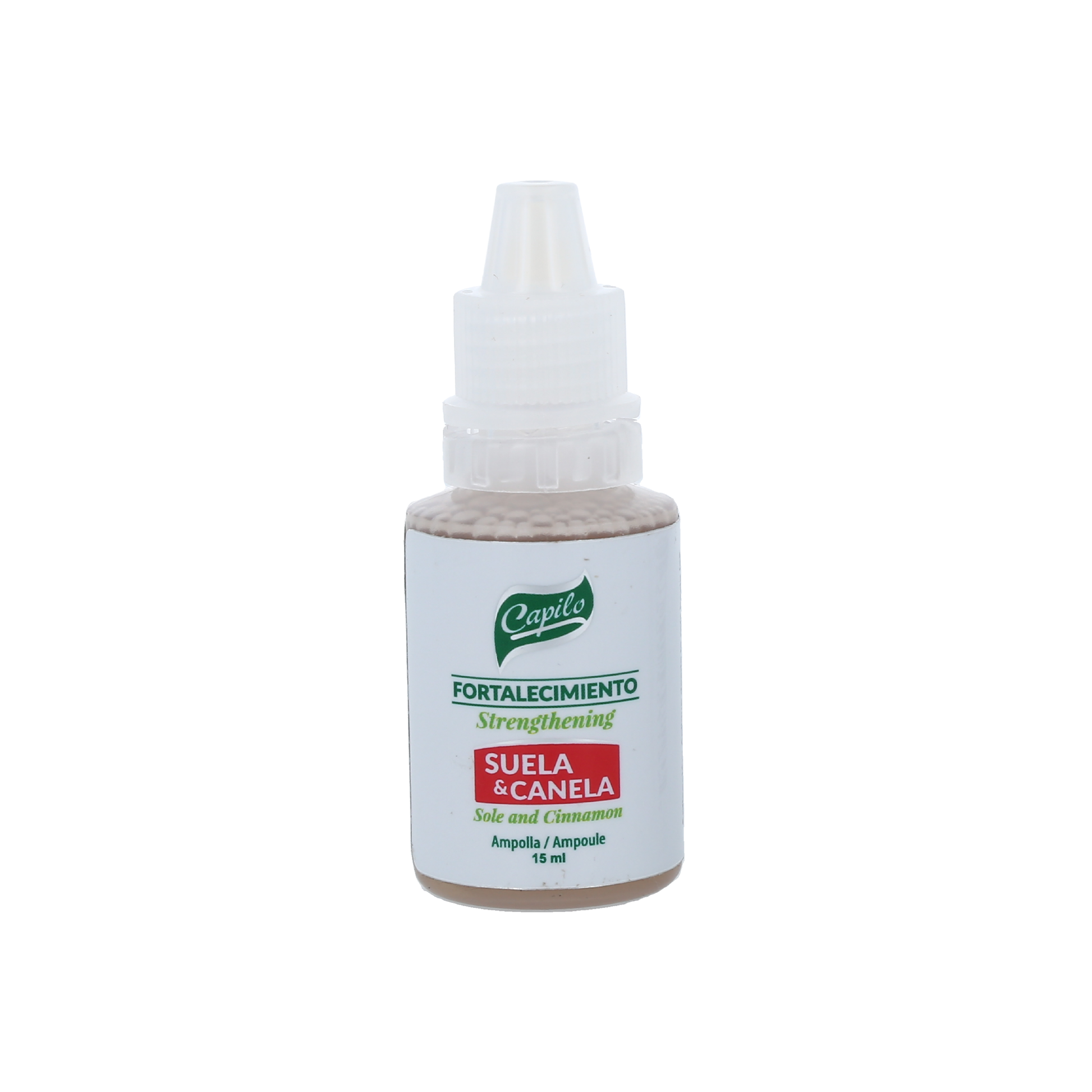 Capilo Ampolla Suela y Canela 15 ml. Esta ampolla está formulada con extractos naturales de suela y canela, ingredientes conocidos por sus propiedades fortalecedoras y estimulantes del cuero cabelludo. La canela ayuda a mejorar la circulación sanguínea en el cuero cabelludo, mientras que la suela contribuye a fortalecer la fibra capilar, promoviendo un ambiente saludable para el crecimiento del cabello.